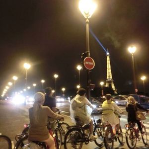 元気いっぱいの女性ガイドさんに連れられてすごいスピードでパリの街を駆け抜けました。15人ぐらいのグループでしたが、集団で自転車で駆け抜ける楽しさを味わいました。4月は9時くらいまで明るいので、夜景がきれいだったのは薄暗くなって訪ねたルーブル美術館と最後に乗ったセーヌ川クルージングです。クルージングではワインなどのサービスもありました。ライトアップされたエッフェル塔がとてもきれいでした。でも川風がとても冷たいので防寒具は必携です。アイスクリーム屋ではゆずとヨーグルトのアイスがおいしかった。あちこちで英語の説明がけっこう長いので、ある程度は英語がわからないと楽しめないかもしれません。