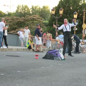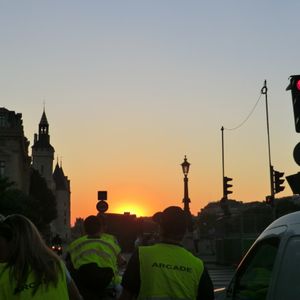 最初は、暗い中を夜景を見ながら、自転車で走るものと思っていましたが、パリに着いてみると、7時半でも昼間のような明るさで、自転車のナイトツアーで、夜景がみれるのかと心配していました、しかし、よく考えてみると、真っ暗だと引率者も見えないし、もちろん蛍光ベルトのついたベストを着ているので見えるのですが、危ないですよね、自転車は、車道を走るようになっていて、バスレーンと自転車レーンを走ります。バスレーンを走っているとき、バスの運転手が邪魔だと言って怒って、引率者に「ポリスに言うぞ」と降りてくる一幕もありました。