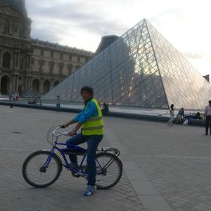 歩いたり、バスで見たりするのとは違って、ルーブル美術館のアーチも自転車で潜り抜け、ピラミッドのすぐそばまで、自転車でいきます。エッフェル塔も凱旋門も。ポン・ヌフ橋も自転車で渡ったと思います。橋を何個か渡ったので、たぶん。