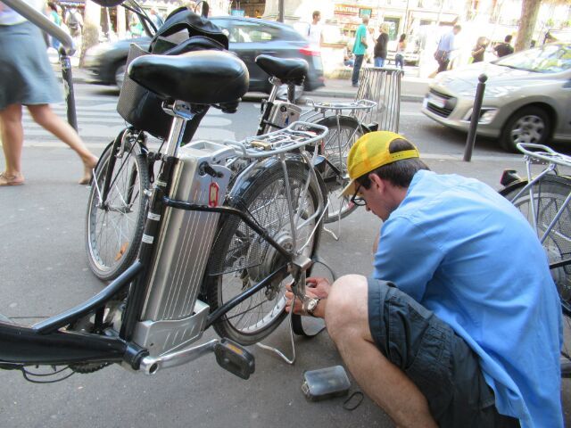 電動自転車は初めてだったのですが、ちょっと漕いだだけですいーっと加速する感じが面白いです。パリは自転車専用道路がある道も多いですが、専用道路がない場合、車と同じ道路の真ん中を走ります。二段右折もしません。原チャ的な感じですね。