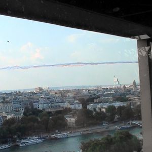隣の席はアメリカ人のご夫婦でしたが、会話を楽しみながら楽しく食事できました。窓の外ではワールドカップの優勝を祝うトリコロールカラーの煙を出して飛ぶアクロバット飛行も同じ目線で見られました。