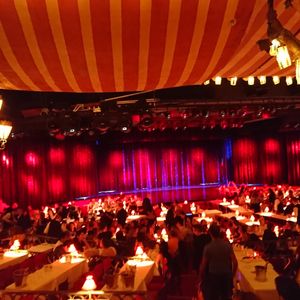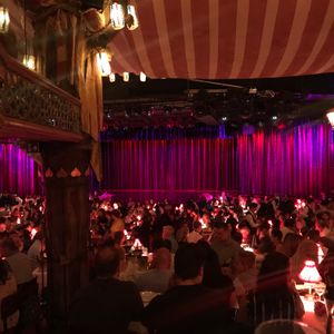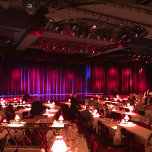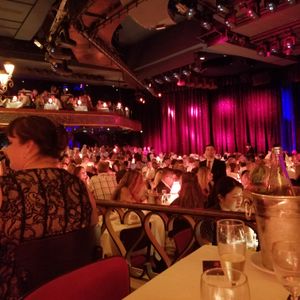 真ん中の後ろのほうで、服装もきっちりした服装をしていき、一番最初に並んだのにとてもがっかりでした。私たちは一番下のランクのお料理を注文していました。味についてはあまり期待していかなかったのですが、以外にもおいしいお料理でした。私たちのテーブルは他の方がシャンパンだけの方たちでした。ショーはとてもよかったのですが、席がいまひとつでした。私たちは2人でしたが、前方の席はグループの方が多いような気がしました。