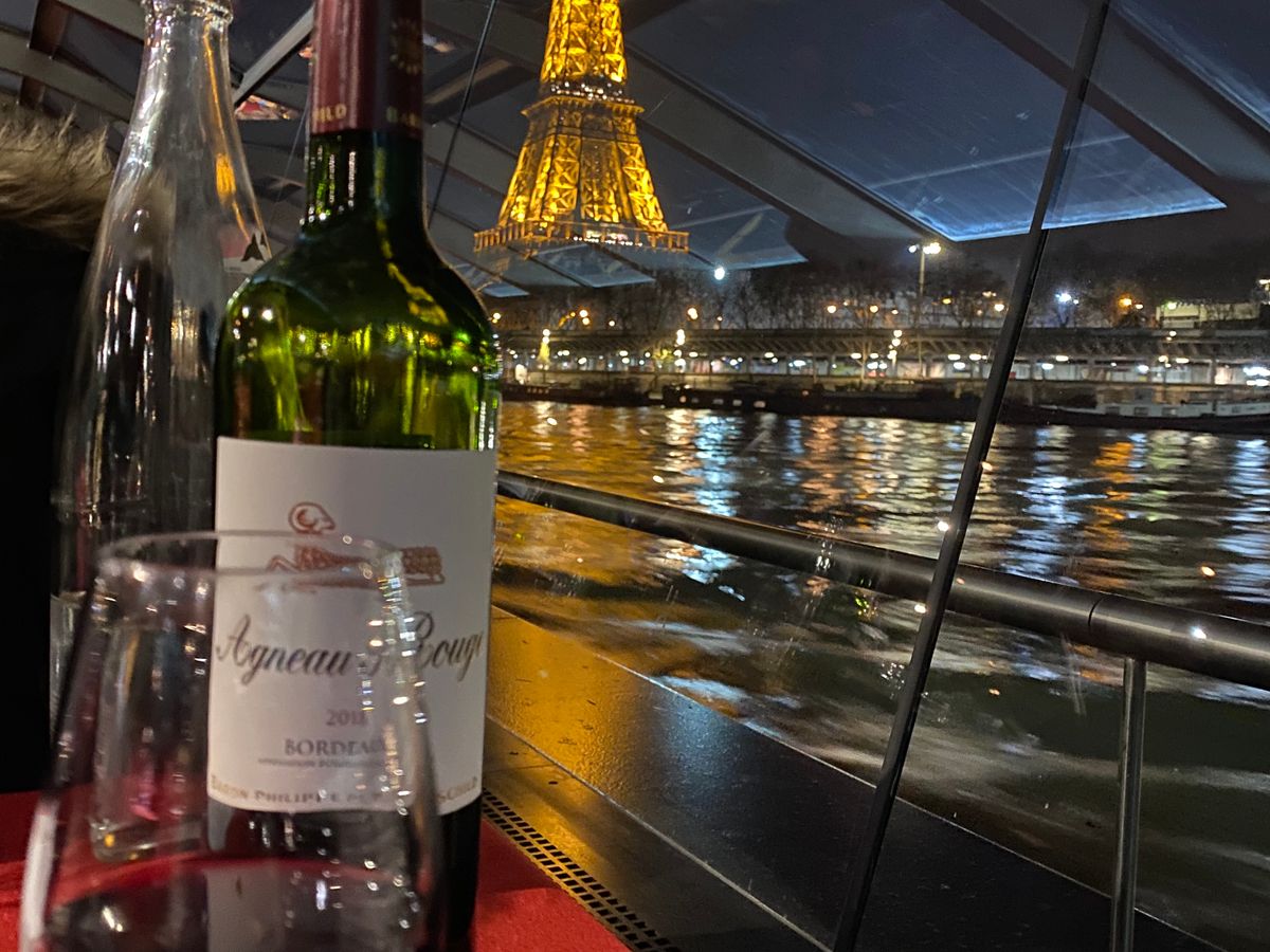 ワインを飲みながら美味しいフランス料理を堪能できました。クルーズ船から見えるエッフェル塔はとても綺麗でした。