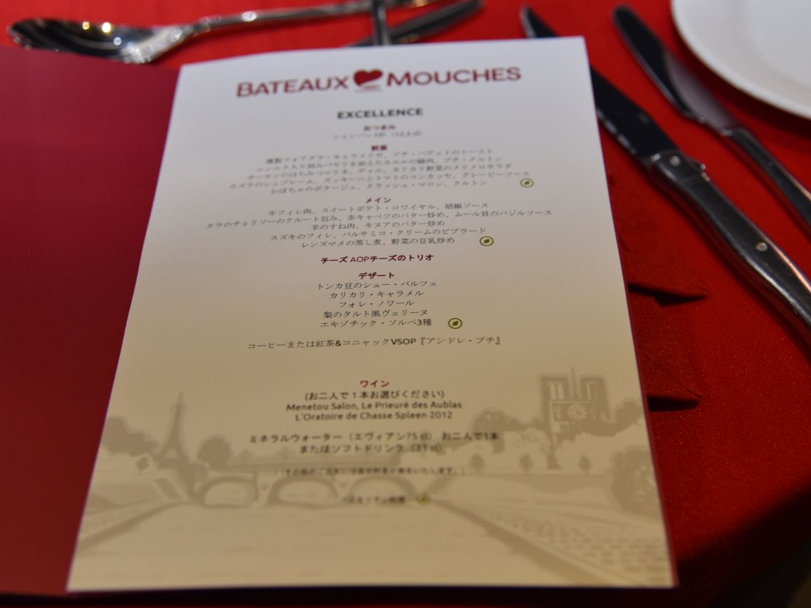 家族で利用しました。服装はかなりしっかりされている方からカジュアルな方まで様々でしたが、スマートカジュアルくらいの格好で行くと良いと思います。メニューは日本語のものがあり、前菜・メイン・デザートを選ぶようになっていました。ただスタッフの方は日本語が勿論分からないので、意思疎通を図るのに少し苦労します(^_^;)(スタッフさんは英語もあまり堪能ではなかった)。 料理は全体的に美味しく、綺麗な景色も楽しめて大満足のクルーズとなりました。食事の途中でデッキに上がって風に当たると気分が良いですよ!(皆がやっているので、マナー的にも平気と思います)。ちなみにメニューの中では、インゲン豆とフォアグラのサラダが一番気に入りました。