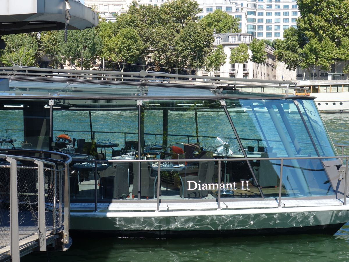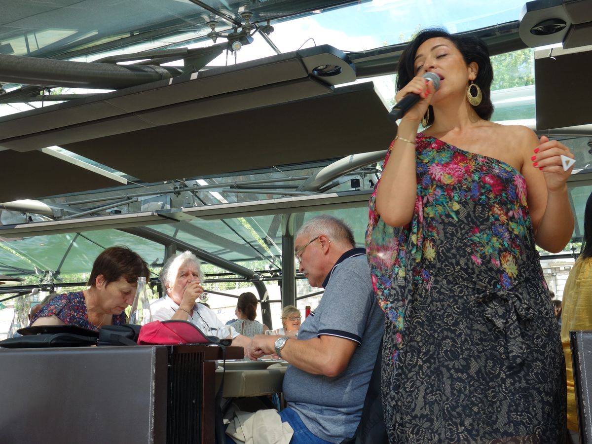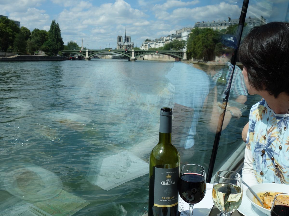 非常に美しいガラス張りの船でのランチクルーズ。船窓からの眺望は言うに及ばす、シャンソン歌手の歌声にワインの酔いが手伝ってにまさに夢み心地。カクテル(グラス)、白ワイン(ボトル)、赤ワイン(ボトル)の順にサーブされる。食事も文句なし。デザートも美味しい。乗船時に日本語のメニューをもらえるので、オーダーも楽。集合から下船まで全て仏語か英語のみだが、スタッフの応対は丁重で、ウエイターは明るく楽しい。