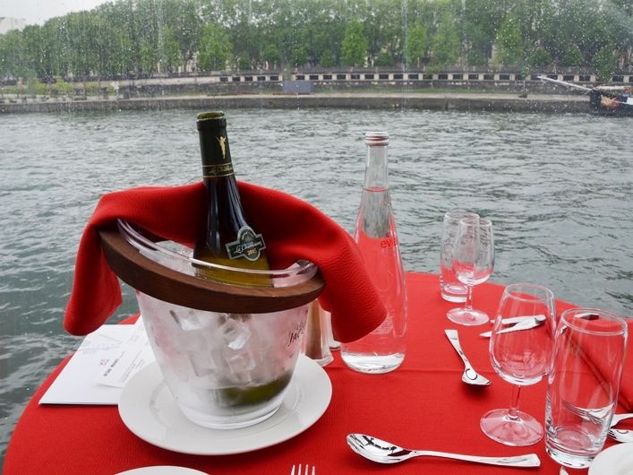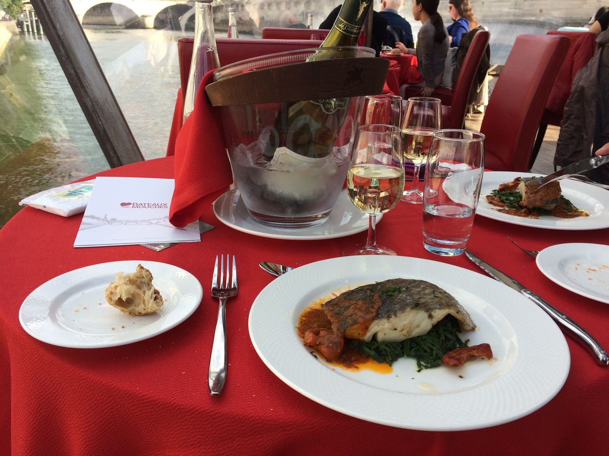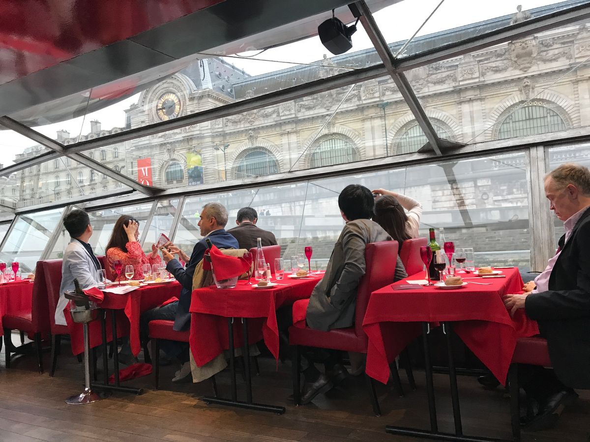 身軽でパリに来てしまい、ドレスコードがあるクルーズは諦めていたら、ランチはOkとなっていたので参加しました。日本人は私たちのみで、周りの外人さんはオシャレしてました。第一日曜日は美術館が無料になるところが沢山あるせいか?空席もありました。4人で1本のワインもほぼ2人で飲んでました。「オーシャンデリーゼ」を歌手の方が近くで聴かせてくれ良い雰囲気。近くの席の方とも英語で愉しく会話し、雨の日でしたが良い時間を過ごせました。