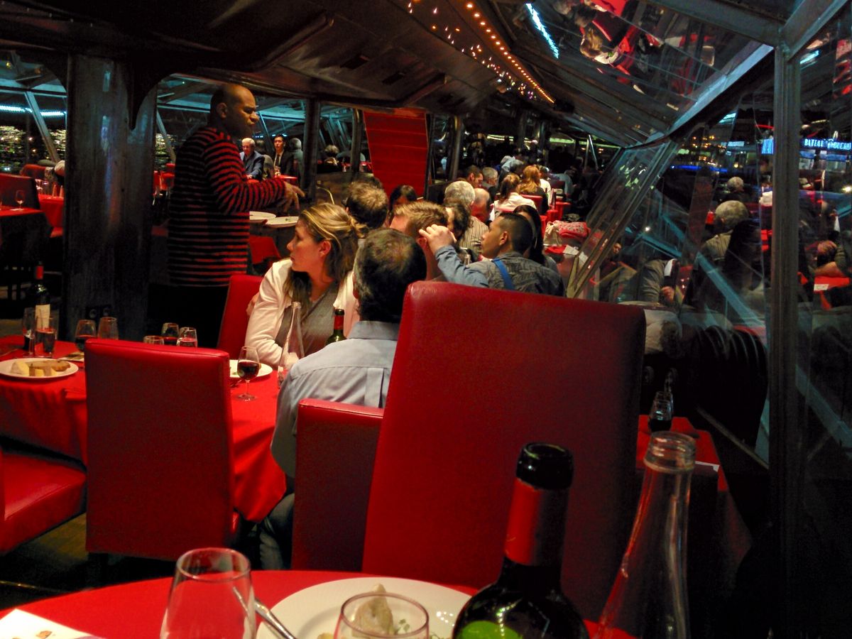 友人に勧められて急遽予約しました。タクシーで乗り場へ。受付を済ませ、アナウンスを待つようにと言われ乗船まで10分ほど。船内は満席ではないものの結構な乗船率です。お手洗いは地下?についていて綺麗ですし、船上へ階段で上がることもできます。お天気に恵まれていれば是非シャンパンフラッシュ時に上がってみてください。パリはなかなか日が沈まないので夜景になるのは10時近くなってからです。出発時間が遅いなーと思いましたが、早い時間だと夜景は到底見れないのですね。納得しました。店員の方も親切に対応いただけますし、今はこれが見えているよと教えていただけます。お料理は十分なボリューム、お味も私たちの口に合いました。私がメインでいただいた鴨がお気に入りです。ワインも1本ついてきてお得な価格設定ですし、ビューもいいしとっても良かったです。パリ滞在時にはお勧め致します。