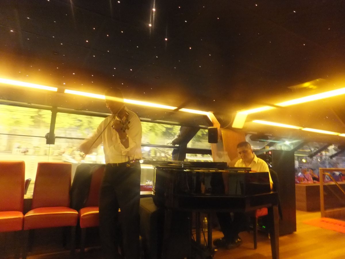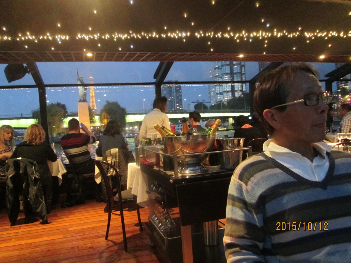 暮れて行くセーヌ川から22時からのエッフェル塔のシャンパンフラッシュも近くで見られ、ムードたっぷり最高のパリの夜となりました。隣のテーブルのおじさまおばさまグループに話しかけられ、「ベルギーに住んでるけど、毎年この船には乗りにパリに来るんだよ。」と聞きました。どのゲストもリラックスして食事を楽しんでいて、生演奏も聴けて、パリ最後の夜をここで過ごせて良かったと思いました。