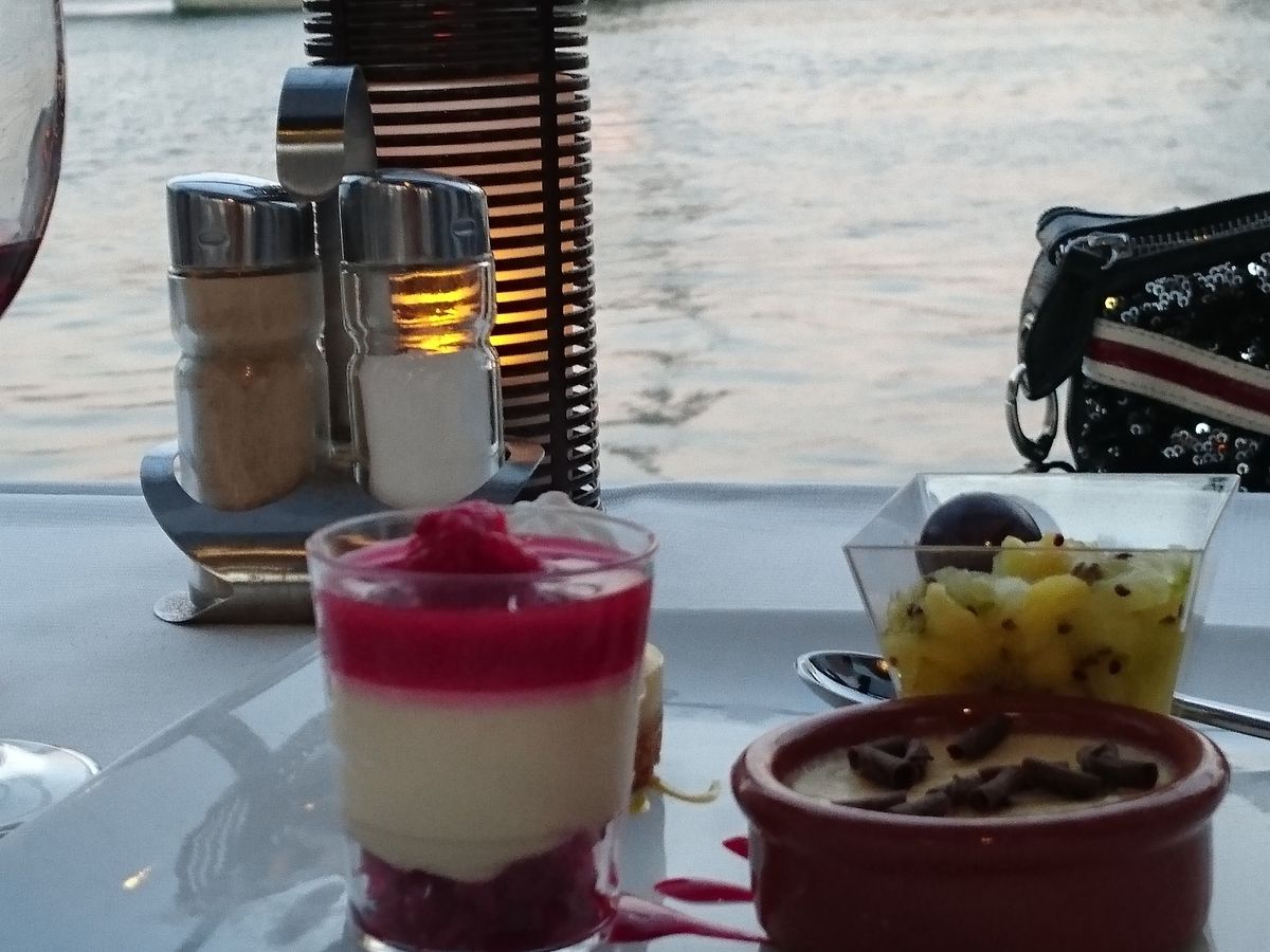初めてのパリだったので、クルーズがしたいと思い申し込みました。船内はおしゃれなレストランになっていて素敵でした。ただ、スタッフさんが早く料理片付けたいのか、何度かfinish?と聞いてきたのが残念でした。料理も1日目だったのでこれが普通なのか微妙なのかわからなかったのですが、その後の滞在で食べた料理の方が安いし格段に