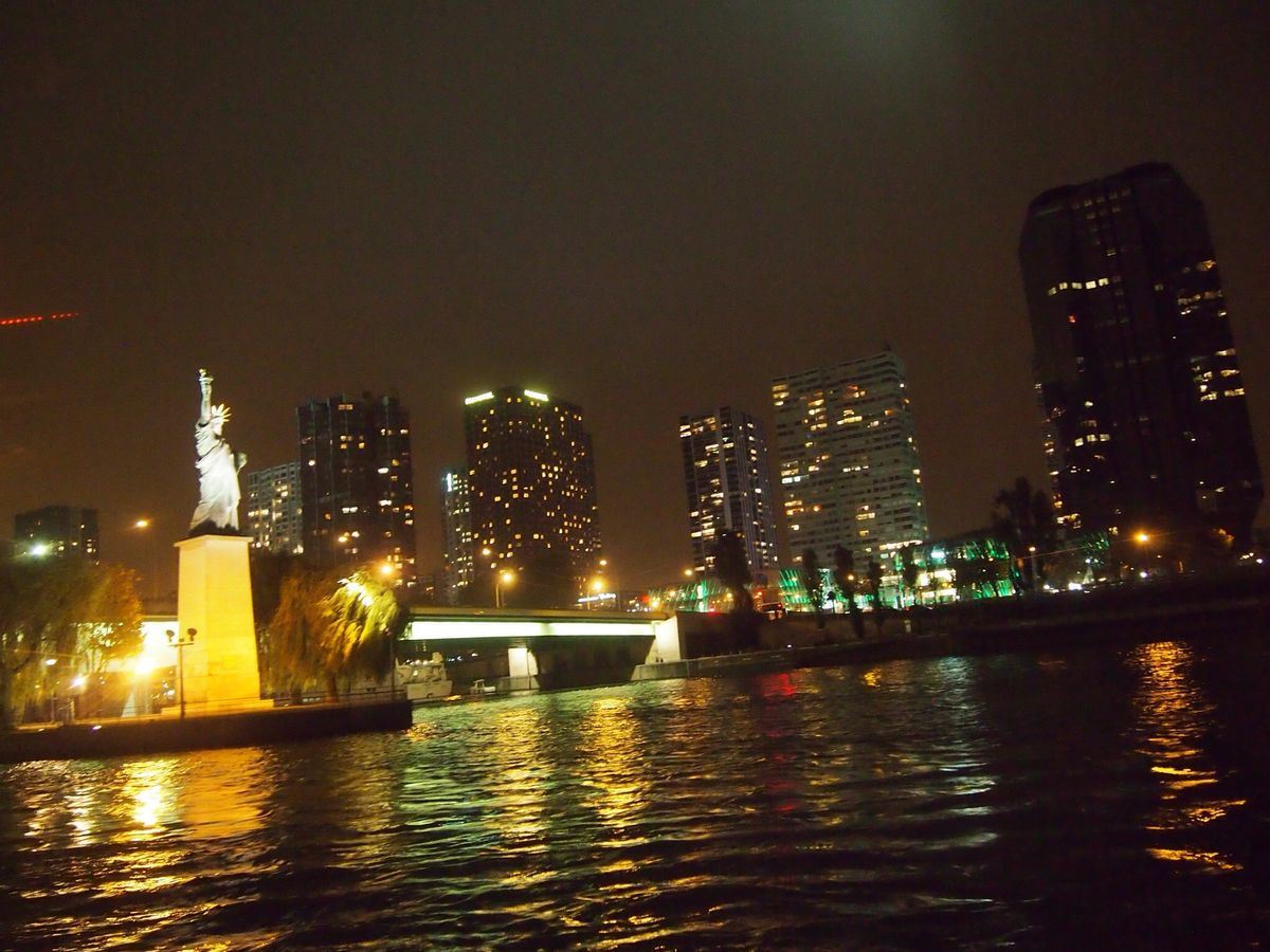 時間通りに出船、飲み物を注文し食事開始です。最初にシテ島方面に向い、ノートルダム寺院の夜景を観賞。このライトアップは日本人の石井リーサ明理さんが作られたそうですね?シテ島の先で折り返し、エッフェル塔、自由の女神を観賞します。両岸の街並みも綺麗でした。