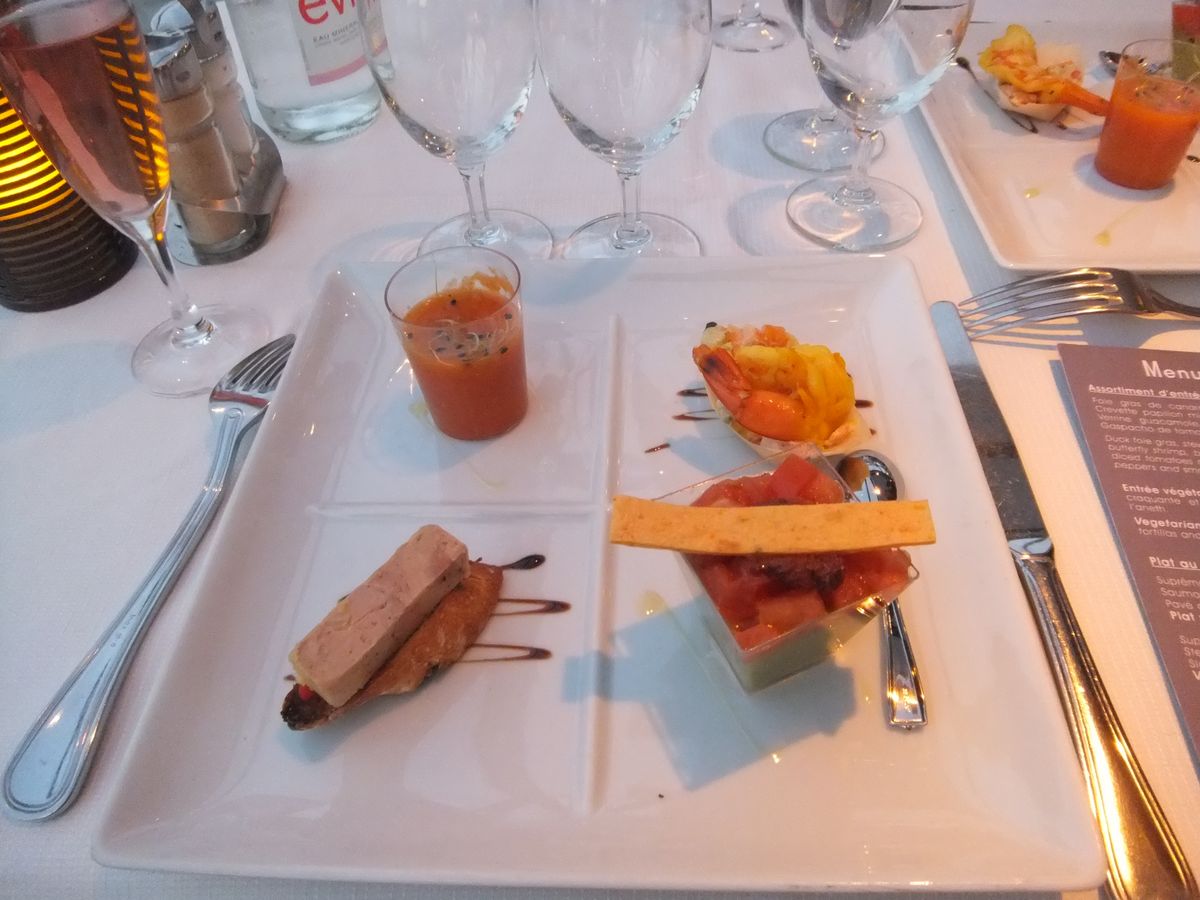 前回もそうだったんですが、この時間帯の出航が一番良いような気がします。 乗船時には明るくて、食事をしながらエッフェル塔に向かう途中にだんだんと夕暮れになって、途中で折り返す時には辺りはすっかり暗くなり、この時間の経過とともに変わる景色を楽しむ事が出来ます。 食事もこの内容で十分の量だし、とても美味しいと思います。
