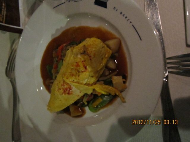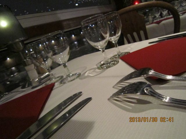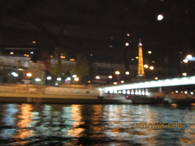 エッフェルの下のセーヌで出発です。フランス、ドイツ、アメリカの方々と一緒の席でした。当日は船が動かず2時間以上ディナーでワインを飲みすぎてしまいましたが、隣の席のフランスの夫妻とアメリカの夫妻の方とカタコトでも楽しく過せました。後で分かったことですが、船の故障でした。料金が戻されました。アラワンちゃん、さすがです。