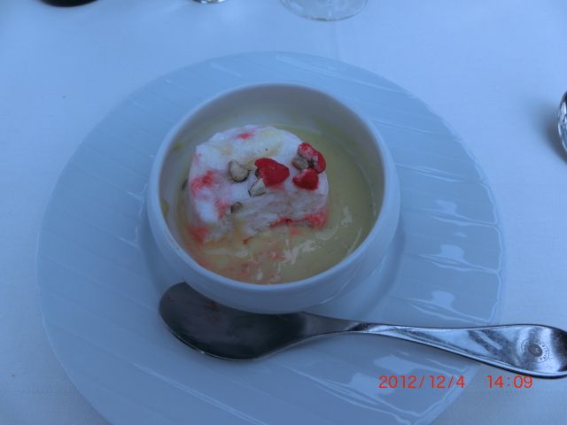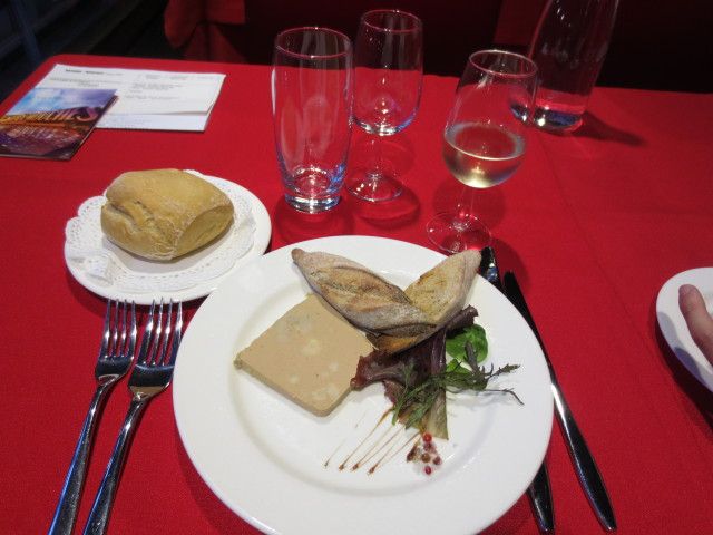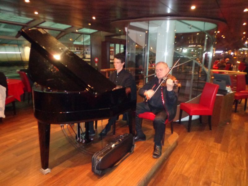 集合時間より早くついて、船がぎりぎりまで来なくて寒くて少し不安になったけど、ガラス張の一番前のテーブルに案内されて、ながめムードは最高でした。前菜のオードブルはとても美味しかったけど、ステーキは6ユーロ追加料金で、硬くていまいちでした。お魚はおいしかったです。8時に終わって、歩いてクリスマスマーケットに行けました。