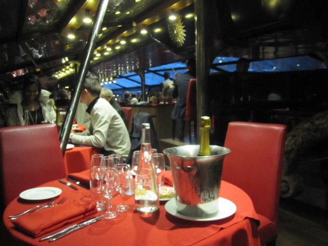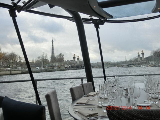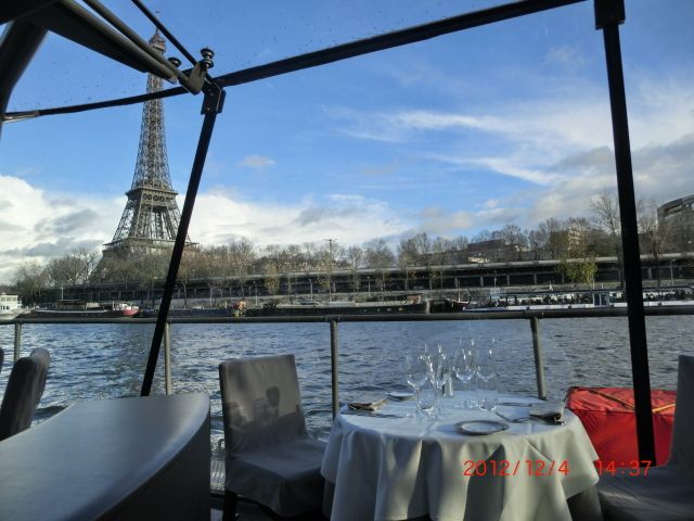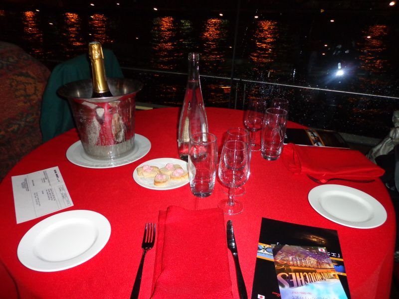 2人の場合は前方とクチコミに書いてありましたが、最前列で最高の眺めでした。お料理は、まあ、こんなもんだろうって感じですが、ディナーはその辺のレストランで食べてもこの位払うようです。それを考えたらクルーズがついている分文句なしです。旅行ツアーで一緒になった人は、某日本人向けディナークルーズに参加しましたが、窓際は相席で155ユーロだと言っていました。料理は同じ位らしいです。何だかすご~~く得した感じ。場所もぜんぜん分りにくくない。みんなのクチコミが大いに役立ちました。エッフェル塔が感動するくらいきれいでした。他の建物は思ったよりライトアップもなくたいしたことはありませんでしたので、今度はランチクルーズも参加したいと思います。私達はRER線を使いましたので、目の前でとっても便利でしたがRER線が不安な人は地下鉄もすぐ近くです。