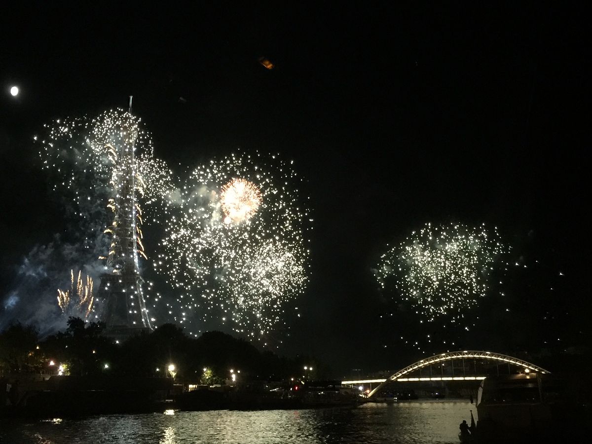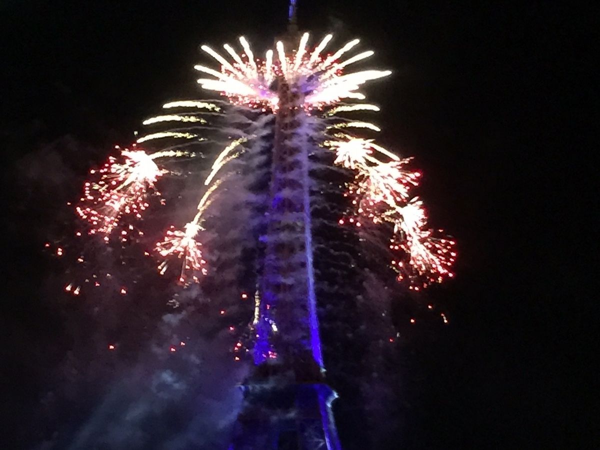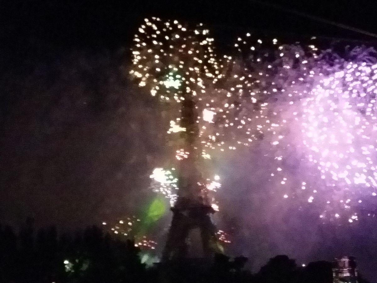 花火は、凄かった!夜空を横面一杯広範囲に花火が華やかに、そしてダイナミックに彩りました。エッフェル塔からも花火が止めどなくうち上がり、塔が溶けないかしんぱいしました(笑)