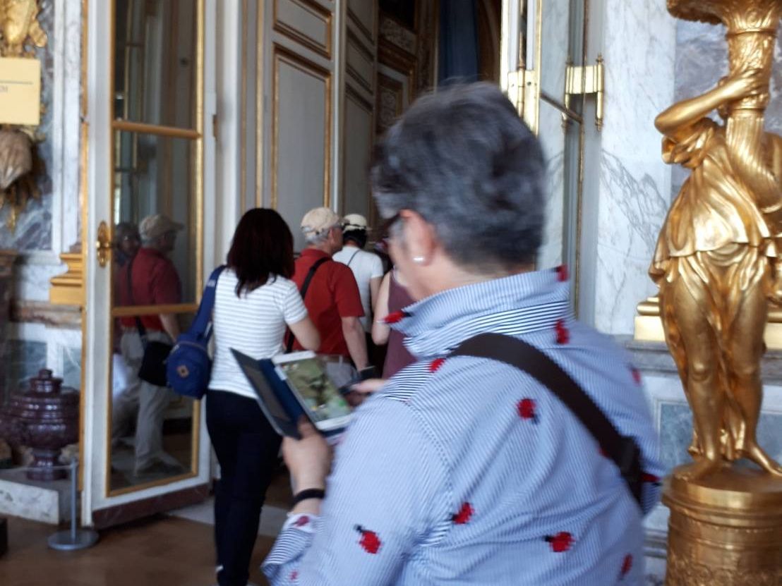 午後からのツアーだったら、12時30分位に受付をしてゆっくりお茶してベルサイユ宮殿ツアーに出発、団体客の入場は以外と待たされ、異常気象の30度近中の待ち時間は長く感じました。もちろん、案内告知は英語とフランス語、しかも英語とフランス語のグループに分けられ胸に着けるシールもオレンジとブルー⁉分かりやすいと言えば、分かりやすい‼ガイドさんを捕まえて判るまで、何度も聞きました。到着はその時の交通渋滞に拠るので、4時30分パリビジョンの黄色いバスをさがして集合、何とかなるもんです。自分の判るまで聞く事が一番大切かな‼