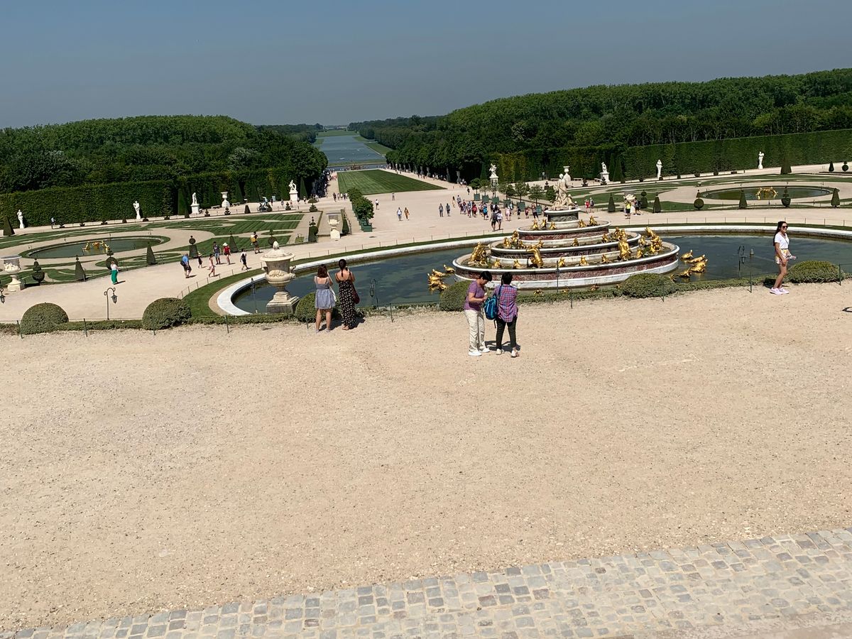 英語のツアーの人達と一緒にバスでヴェルサイユへ。到着後、それぞれ別れて観光になります。私達のガイドさんは男性のフランス人。説明内容があまり聞き取れず そして説明内容も少なかったです。隣のツアーの日本語ガイドさんが優秀で羨ましいと思ってしまいました。ともかく気温が35度ぐらいの暑さだったので 日傘、帽子、サングラスで乗り切りました。このツアーはトラムやカートを使わず ひたすら歩いて回るので 相当歩きます。ゆっくり歩くので 急ぐ必要は無いですが1万歩以上は歩いていると思います。ランチは期待しないでください。ヴェルサイユ宮殿はそれなり。プチトリアノンが目的だったので内容は満足です。