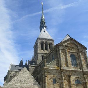 大階段を登り、変遷の模型のある部屋を過ぎると、いよいよテラスに出ます。テラスはいわばモンサンミッシェルの大展望台で、まわりの入り江と海が一望できます。付属教会から中に入って、回廊、食堂とつづき、そこから階段を降りると、途中の踊り場に大天使ミカエルとオーベル司教のレリーフがあります。これはモンサンミッシェルの由来を表すものです。