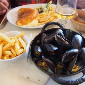 昼ご飯はバスの中でミールクーポンを買い、バス停付近のレストランで食べた。前菜でオムレツを選べたため、メインはムール貝を選べたので良かった。オムレツはかなり薄味なので、メインだと物足りないかもしれない。