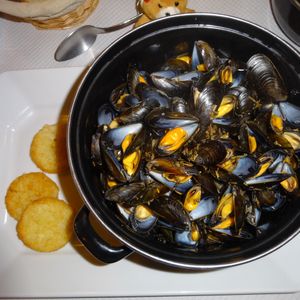 ランチはバス車内でアシスタントさんおすすめのランチ(20€)をお願いし、名物のオムレツとムール貝を食べました。ムール貝は量も多く、美味しかったです。