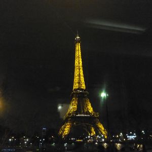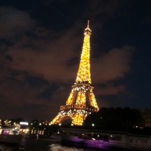 フランスは20時半でも明るく、夜景を楽しめるのかと気が気でなかったのですが、これまた、いらぬ心配でした。というか最高のナイトクルージングでした。 夜のとばりが下り、セーヌ川沿いが、ほのかな明かりにつつまれるにつれ、乗り合わせたフランスの女学生さん方かと思しき集団のどこからともなく始まった『オー、シャンゼリゼ〜』(もちろん、フランス語でしたが)の耳に馴染みの歌声が、弥が上にも、パリの夜景と旅情をひきたててくれました。そして、昼とは様変わりし、ライトアップされたエッフェル塔の、22時ジャストから始まる明滅のサプライズを、終着する前に、乗船したまま遭遇できたことは絶好の思い出写真の撮影機会となりました。ただし、写真を撮りまくっていたにもかかわらず、見とれていたせいか、ピンボケが多くて、あまりいい写真はありませんでした。チカチカと明滅するところの一枚を愛嬌に掲載します。
