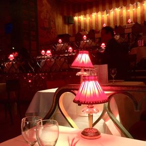 受付をすませて日本語のパンフレットを買いテーブルに通されるとそこは落ち着いた証明に赤いテーブルランプが幻想的な空間で生バンドと歌を聴きながらコースを頂きました。日本語の曲も演奏されました。なぜか「なだそうそう」でした。