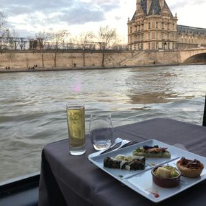 18時45分のクルーズに参加しました。オルセー美術館の前の川岸で受付していただき船内へ。指定されたテーブルは船のちょうど中央、真ん中に給仕カウンターような所の隣に案内されました。正直、片側しか見えないかもと思いました。出航時間になってもテーブルは半分ぐらいのお客さんです。テーブルチェンジもと思いましたが、クルーズ船は行って反転するので、片側でもいいか?と思いそのまま出航となりました。最初、上流・東向きに動きだし、すぐシテ島のノートルダム大聖堂の前を夕暮れ時に通り過ぎました。食事も進み、船が反転し、夕闇に包まれた頃、エッフェル塔の前を、その時ラッキーにもシャンパンフラッシュです。とても優雅な気持ちになれました。テーブルチェンジせずとも、2つのランドマークを一番良いタイミングに目の前で堪能でき、結果OKでした。お料理は口コミで色々とありますが、ふつ~に美味しいですよ。何より、ゆっくり落ち着いて座れて、景色が流れ、親子でお話ししながら食事できて良かったと思います。お値段コスパとしては、とても良いと思います。また機会あれば乗りたいです。