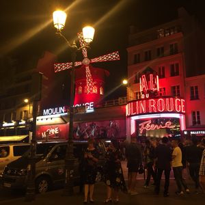 ムーランルージュの日本公式サイトよりベルトラさんのほうが安かったので出発する1か月前にベルエポックメニューで予約しました。当日の服装私は黒のワンピースに大ぶりのネックレス、ピアス。夫はジャケット、ワイシャツ、ネクタイで18時すぎに並びました。先頭から10人目ぐらいでした。(バウチャーは17時頃に隣のチケットショップで交換しました。開場まで時間があったので写真を撮ったり近くを散策しました。)