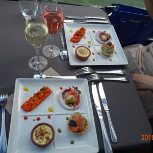 お料理も美味しく、量も適当でちょうどよかったです。素晴らしい夜景が楽しめました。エッフェル塔の付近でちょうど23時頃停泊するので時間限定のイルミネーションを見ることができました。セーヌ川は波もなく船もスムーズに運行するので船が苦手な私でも問題ありませんでした。昼間とはまた違ったパリの雰囲気が楽しめてよかったです。7月参加でしたので日の入りが22時過ぎと遅いので21:15発のコースが夜景を見るなら最適です。