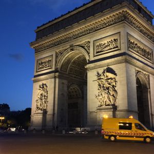 日が暮れたばかりで、黄昏のパリの街が素敵でした。凱旋門でバスを降り、写真撮影。