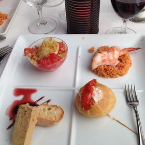 まだ外は明るい。ドリンクを聞きに来るのでグラスワイン(7€)!料理も魚か肉のチョイス!