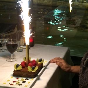 参加日は母のBDでオプションのケーキ×5名分をオーダー。Q&Aではケーキはスライスケーキ、歌のサービスはない…との事であまり期待はしていなかったのですが、メインの料理を食べ終わるタイミングでBGM、スタッフの拍手と共に豪華なケーキが花火を上げながら運ばれてきました!(ケーキは今回5名分オーダーの為ホールで用意していただけたと思います)母は勿論、私にとってもサプライズで本当に素敵な瞬間でした。スタッフは皆フレンドリーで、景色やお料理も十分楽しめます。