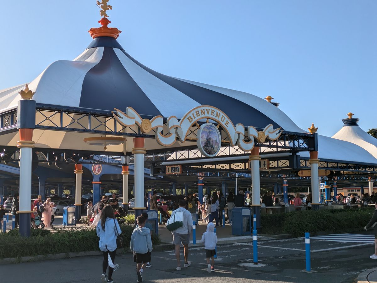 バスは定刻より早めにオペラ前のLANCELへ到着していました。乗車の際に、パークチケットと帰りのバスのチケットをくれるのでなくさないように。Paris ディズニーのアプリにチケットを入力しておくと、紙のチケットが万が一なくなっても安心です。問題は帰りの乗車場所。先ず下りる際に運転手にどこでバスに乗れば良いか確認しておくこと。それから、下りた場所の写真を数枚撮る。その後、エントランスへ向かってかなり歩きます。この途中も何枚か写真を撮っておくと後で役立つことも。帰りは、出口を真っ直ぐ行かずに、左に曲がりRERの駅を目指し、歩く歩道をひたすら歩く、出口から10分はみておかないとかなり焦る結果になるかも⁈行きは左手が壁になり向こう側の景色が分からないので、壁のうえに見える建物を覚えておくといい。行きは右手に駅が見えることになる。22時閉園の時はバスは21時出発になるので、15分前位に止まっているとのこと。サマータイムの時は周りがまだ明るいので景色も確認しやすいが、秋から冬や春などは集合時間には暗いため、帰路の確認をしっかりしておくと慌てない。