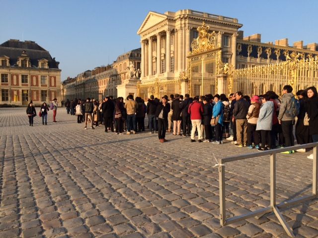 参加日が日曜だったため渋滞のない朝のパリを抜け、ベルサイユ宮殿には開館9:00の20分前に到着しました。チケットは事前配布されるので購入待ちの列に並ぶ必要はないものの、入場のための手荷物検査待ちには既に行列が…。