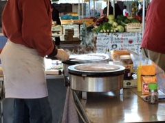 マルシェは、生鮮食品や野菜、果物が売られています。日本人向けのお塩屋さんやフォアグラ屋さんも出店していました。お塩屋さんはクレープも焼いていて、日本語で書かれたメニューがありました。クレープを食べながら、マルシェを散策しました。マルシェでの時間は短かったですが楽しかったです。