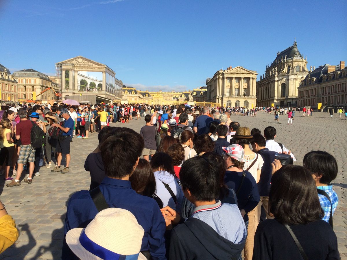 ベルサイユはガイドさん付きなら並ばずOKですが、このコースは夏休み中は最低30分、混んでいると朝1時間は並びます。今回天気が大変良かったので30分も苦になりませんでしたが、翌日は雨だったので、雨の中広場で並ぶのは大変かもしれません。中も有名な部屋は、押せ押せ状態で、スリに注意!!と連呼していたアシスタントさんの言葉を思うとゆっくり見る事は出来ません。