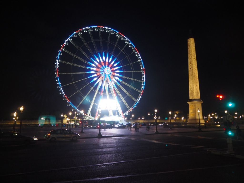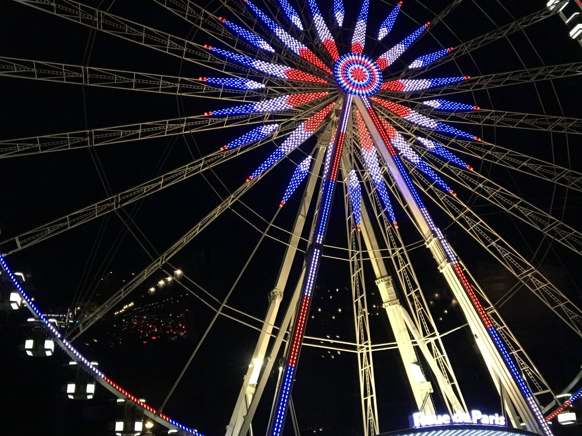 観覧車のイルミネーションがきれいでした。下車して撮影したかったですが、テロをうけての市民の意向を現したものと伺い、不謹慎なのかな~とも後から思いました。
