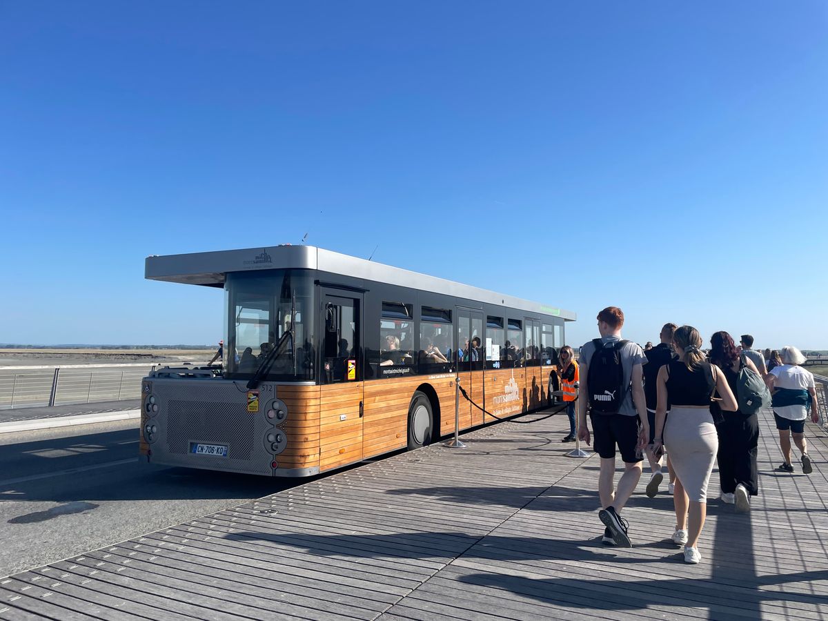 観光バス停車位置からモンサンミッシェルまで無料のバスがありますが行きも帰りも人でいっぱいです。すぐ次の便が来るので少し待てば行列も解消されていきますが、私は行きはツアーの皆様と同じようにバスで、帰りは20分ほど歩いて観光バスのところに戻りました。