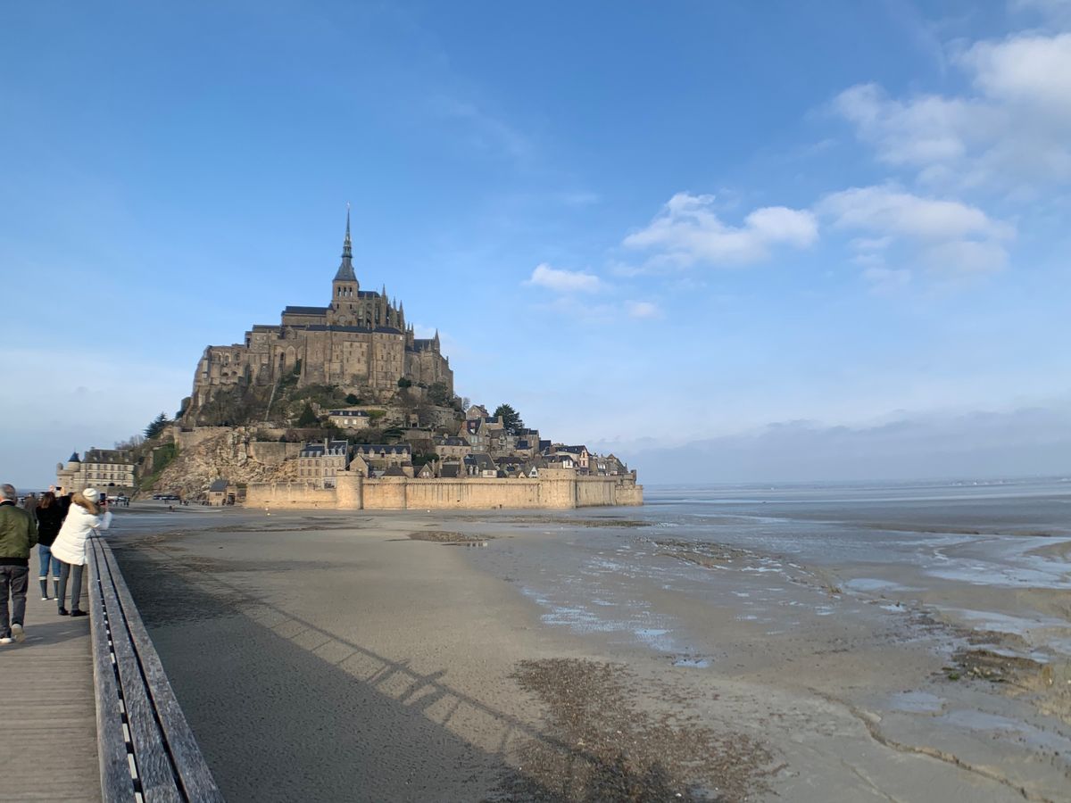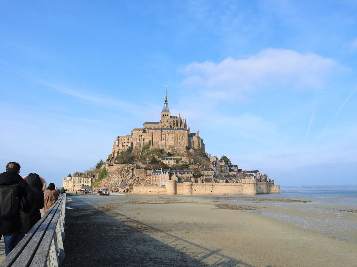 初めてモンサンミッシェルに行きました。実際に観るとやはり荘厳です。途中立ち寄りのオンフルールは、本当に写真撮る時間しかないので、ここにこだわる方は、早めにバス降りてお目当ての場所に行くべきです。モンサンミッシェルは、冬季、しかもフランス国鉄ストライキ中だったので、ガイドさんも驚くような人の少なさだったそうです。お陰でレストランも空いていたし、見学も全く待たずに回れました。私も日帰りか、泊まりか迷いましたが、今回は日帰りで十分すぎるほど時間ありました。