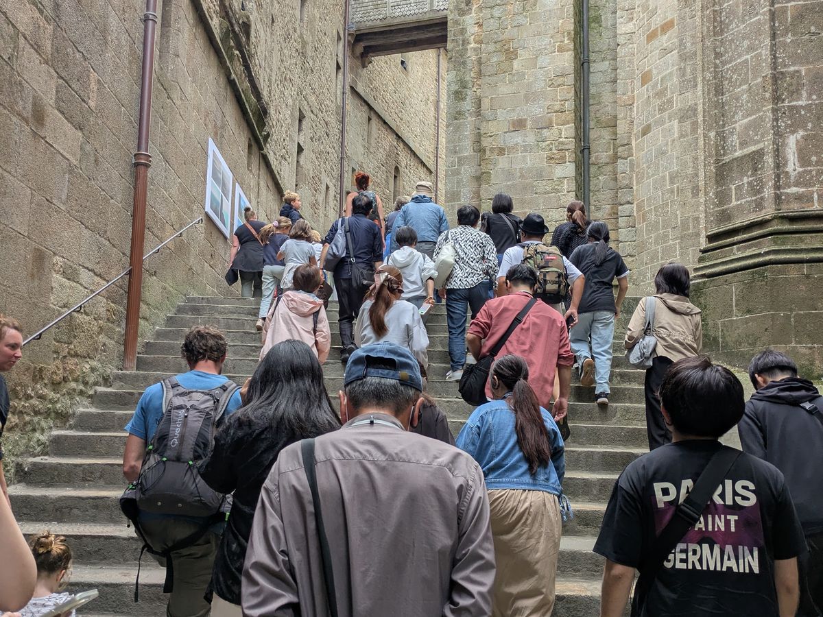モン・サン・ミシェルは遠いので、片道4時間30分くらい、おまけにモン・サン・ミシェル内は人が多く、修道院へ行く道も、中も階段の連続です。