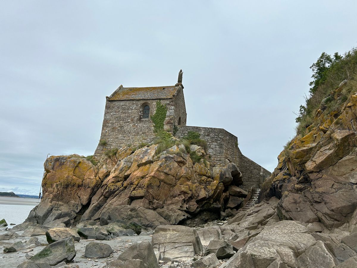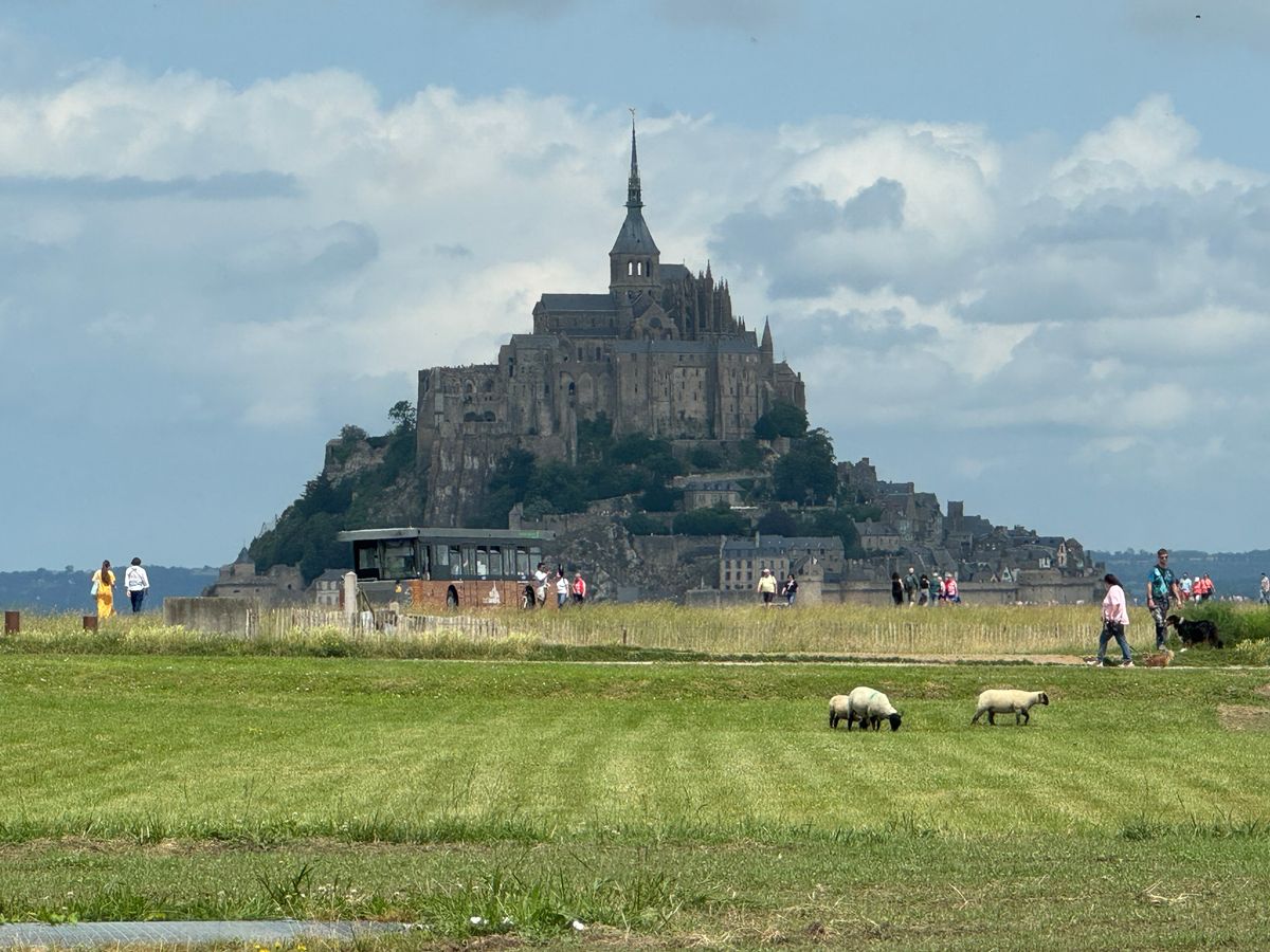 今回モンサンミッシェルへ行くにあたって、干潮時、満潮時の両方の姿を見たいと思い、一泊でのツアーに申し込んだ。宿泊は島外のホテルからモンサンミッシェルが見える「ル ルレ サン ミッシェル」。行きは日帰りの皆さんとバスでモンサンミッシェルまで行き、帰りは翌日のツアーの方達と帰ると言うパターン。ノルマンディーのいなか村は、ブブロン・オン・オージュ。「フランスの美しい村」に認定されている可愛らしい村。添乗員さんに村の案内していただいた後自由散策。いよいよモンサンミッシェルへ。私たちが宿泊するホテルでのランチを申し込んでいた方達もいたので、一緒にホテルまで行き荷物を預かってもらう。着いた時のランチは、オプションで当日に申し込み、私たちは島内の「レ・テラス・ドゥ・ラ・ペ」。こちらは、オムレツの「ラ・メール・プラール」の2号店。添乗員さんがレストランまで案内してくださり、混んでいるのにスムーズに海の見える席に着けた。メニューは指定されたオムレツ、タラのマッシュポテト添え、ティラミス、シードルで€35。この日は、修道院には行かず、島内散策。干潮時でないと行けないであろう聖オペール礼拝堂へも行ってみる。ホテルで夕食を取った後、日没に合わせて出かけてみたが、あいにくのお天気で夕焼けは見られず、コロナ以降ライトアップもないとこと。それでも暗闇に浮かぶモンサンミッシェルは幻想的で素敵だった。翌朝も朝焼け見られるか?と期待したが、あいにくの曇り空。しかし、ホテルの部屋で待機していて苦労なかったので、ガッカリ感も軽減。ツアーでいただいた見学のチケットは、どちらの日でも使えるとのことだったので、朝イチで修道院を見学するため8時半頃ホテルを出て向かう。ツアーでいただいた地図がわかりやすく、モニュメントを探すゲームを楽しみながら見学。じっくり見ていたら、あっという間の2時間。モンサンミッシェル限定のお土産を買う。友人はモンサンミッシェルワッペン付きのセント・ジェームスのボーダーT。これは、ここのお土産屋さん限定商品で島内のセント・ジェームスでも買えない。昼食は、「ラ・メール・プラール」でフワフワオムレツ。昨日の2号店とは違う作り方。食べ比べができて良かった。あとは、城壁を歩いたり、お土産屋さんを見たり。帰りは、昨日と違う添乗員さん。両日とも知識豊富で説明もわかりやすかった。ほぼ時間通りにパリに帰着。充実した一泊ツアーとなりました。
