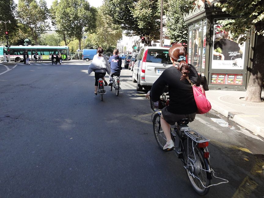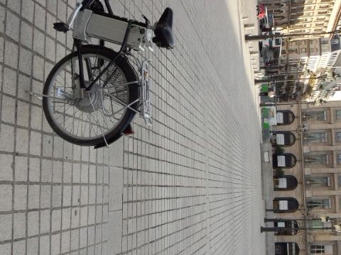 予報上雨が心配されました(2013.9.30)が、幸い降られずにすみました。電動自転車は普段乗れなれたものよりシフト数が多く、タイヤもオフロード仕様の溝が多いもので石畳道を滑らず走れました。ガイドの方の誘導についていけばいいので、迷う心配もなくパリの町の景色を楽しむことができました。ただ、同行者の自転車のモーターの調子が悪く最初は遅れ気味でしたが、シダ化オクレ