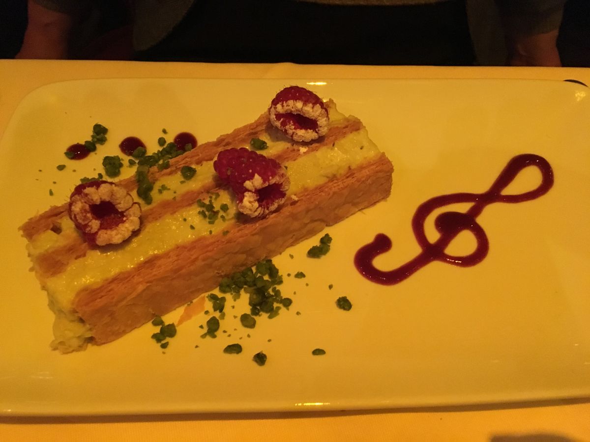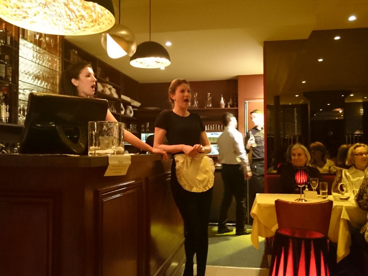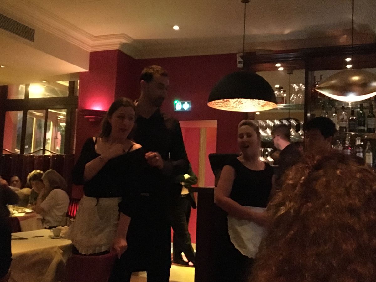 パリにせっかく旅行に来たので、記念に残るディナーを考えておりました。娘との旅行でしたので、夜景のきれいなレストランより、オペラ好きな娘にと考えて、、、ぴったりのレストランでした。私は全くオペラには疎いのですが、聞いたことのある曲ばかりでした。素敵なウェトレス、ウェイターがいきなり歌い出すパフォーマンスは驚きとともに言葉に出ないくらい素晴らしいディナーでした。シャンパンで皆で歌う時は、恥ずかしさより楽しさの方が増して思わず皆と一緒に歌っておりました。ドリンク込みのコースで料金の心配もせずに気軽でした。料理は多すぎず、質量共に満足させていただきました。他のお客様の年齢層は高めでしたが、その分、落ち着いて楽しめました。夜8時に予約させていただき、私どもは11時まで楽しく過ごさせていただきました。最後見送りされるまで、レストランスタッフ皆様には丁寧に気持ち良く素敵な夜を過ごさせていただきました。