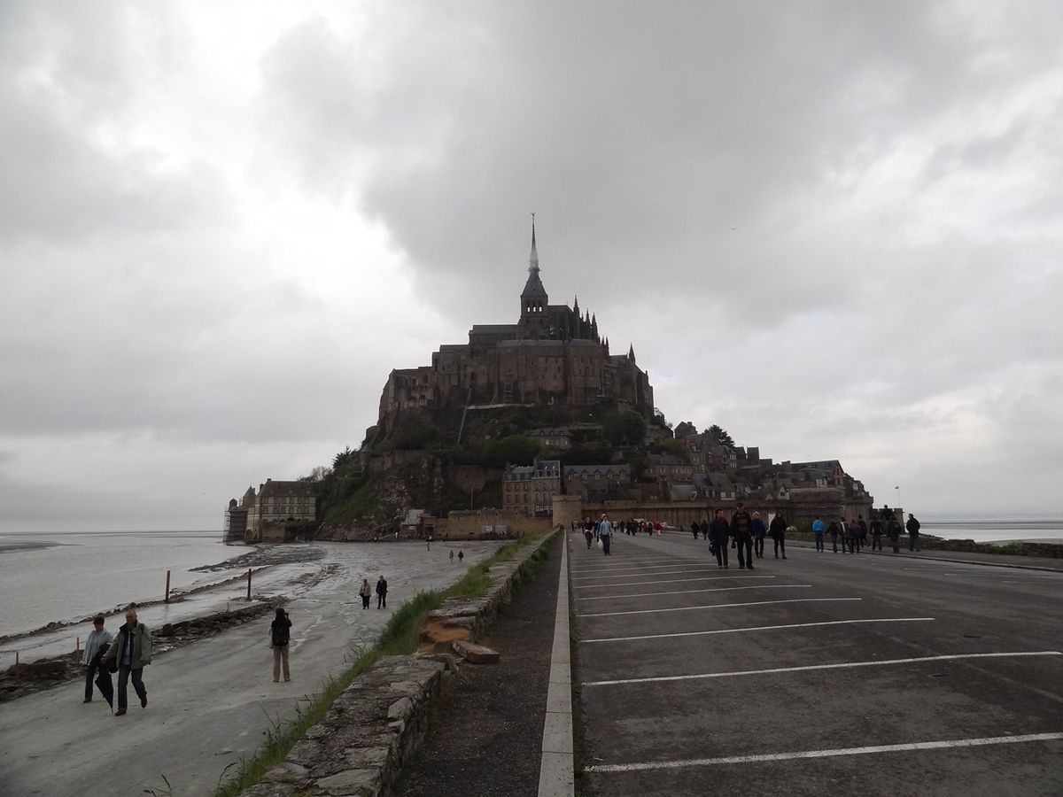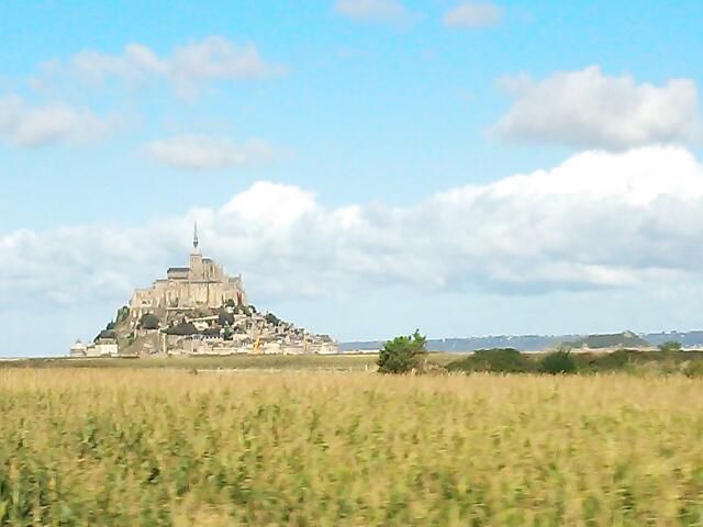写真は、バスの駐車場から眺めるモンサンミッシェルです。ここからシャトルバスに乗って島に行くので、かなりの距離を歩きます。石段ばかりでベビーカーは無理ですし、荷物は少なめにして運動靴がいいでしょう。海辺なので風も強く、天気が変わりやすいです。当日は晴れてましたが、急にヒョウがふりだして驚きました。