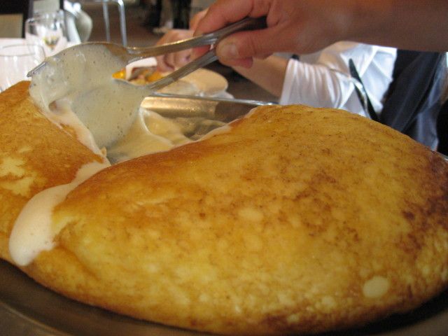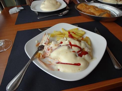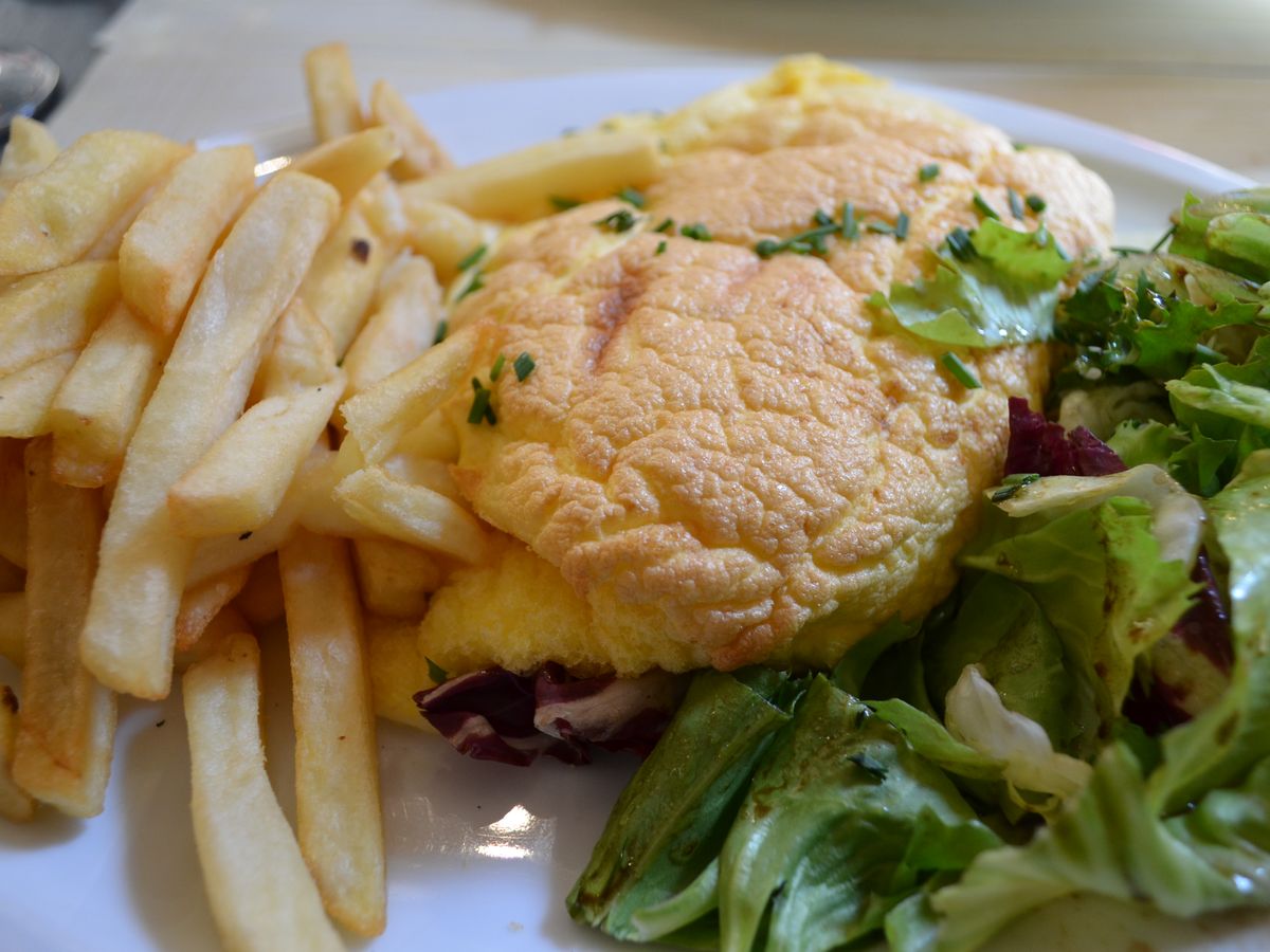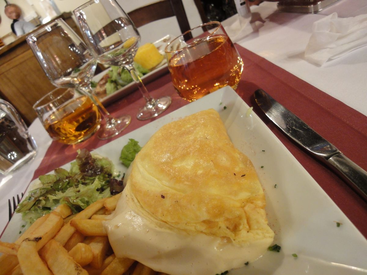 まず昼食は名物オムレツをいただいたのですが、ふわふわというよりは泡立てた卵を生でいただいている感じで、スプーンで食べるような感じでした。モンサンミッシェルの麓にあるお店で提供しているものとは全くことなり、とても残念でした。