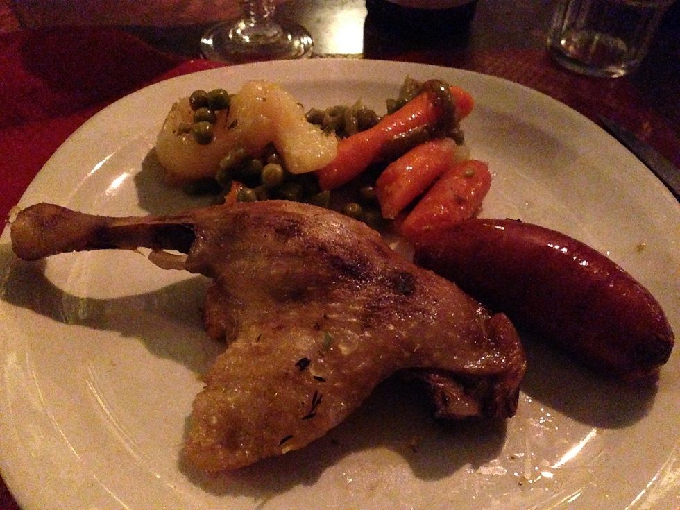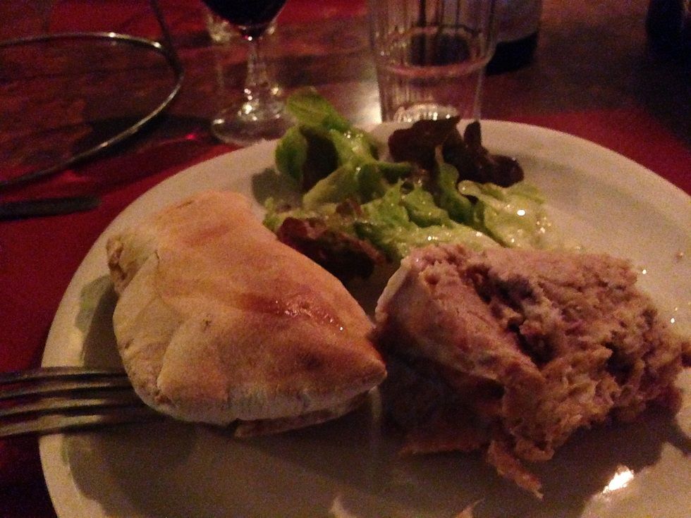 豚肉のパテ?意外と美味しいです。出てきた中で一番はウインナーですね。洞窟の中のようなレストランの雰囲気は百点です!