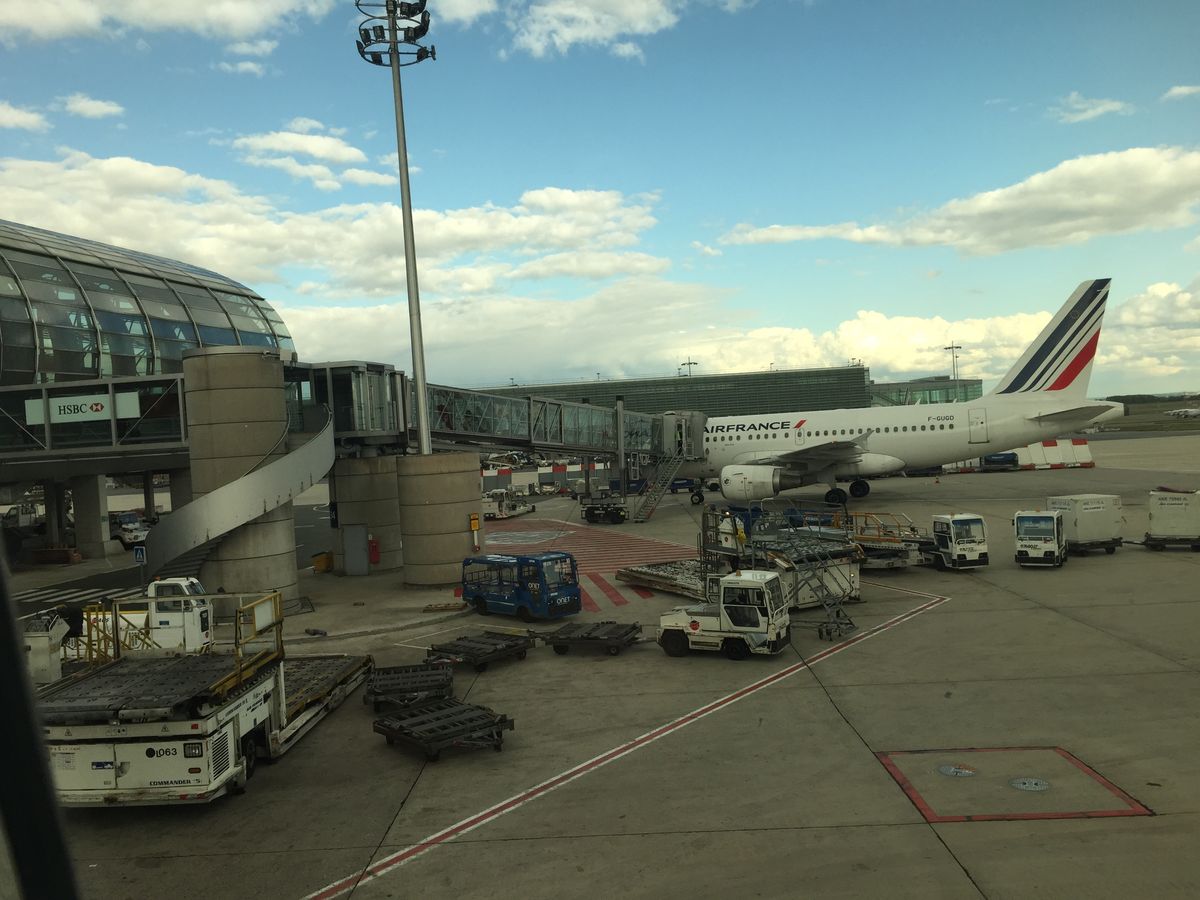 シャルルドゴール空港に17:10到着予定で17:05に到着しました。しかし、入国審査が長蛇の列で、待ち合わせ場所のゲート出口付近に到着できたのは、約束の時間から15分遅れの18:15。遅れたにもかかわらず、しっかり名前の札を掲げて待っていてくださり、一安心でした。その後、市内に向かう高速は事故渋滞で、一般道を通ったこともあり、2区のホテルに到着したのは19:50でした。車の位置はグーグルマップでモニタしていましたが、トラブルの中、最善のルートを通っていただけたと思います。