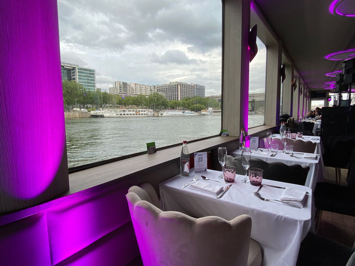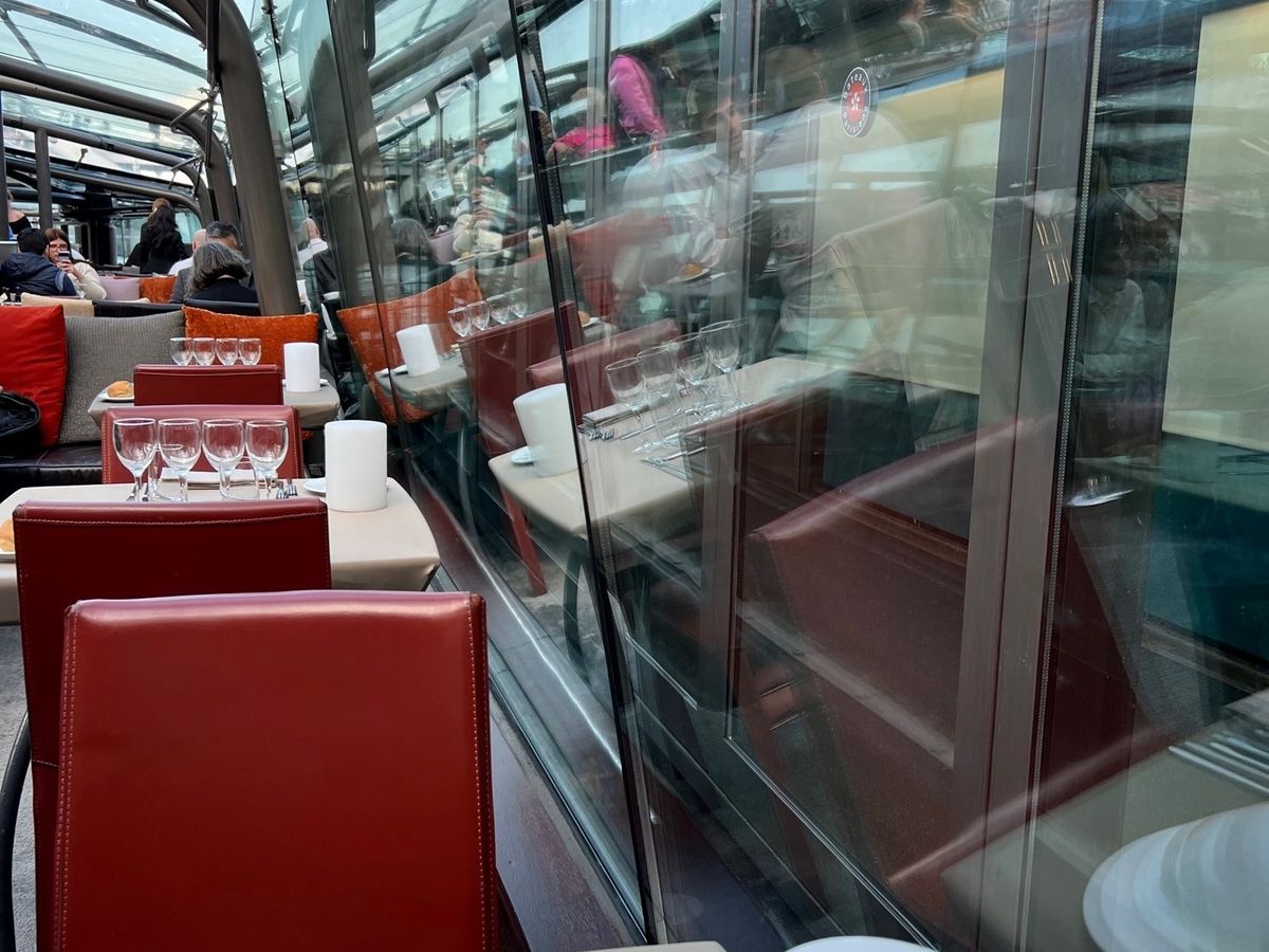 眺め優先で前方席を予約しましたが、晴天にも恵まれ、全面ガラス張りの窓側の席からの眺めは最高で、5月中旬でしたが汗ばむ程でした。グラススパークリングワインとフルボトルワイン(白、赤)付きの3コースの食事も美味しく、パリ市内をゆっくり観光しながらのクルーズを楽しみました(お薦めです)。