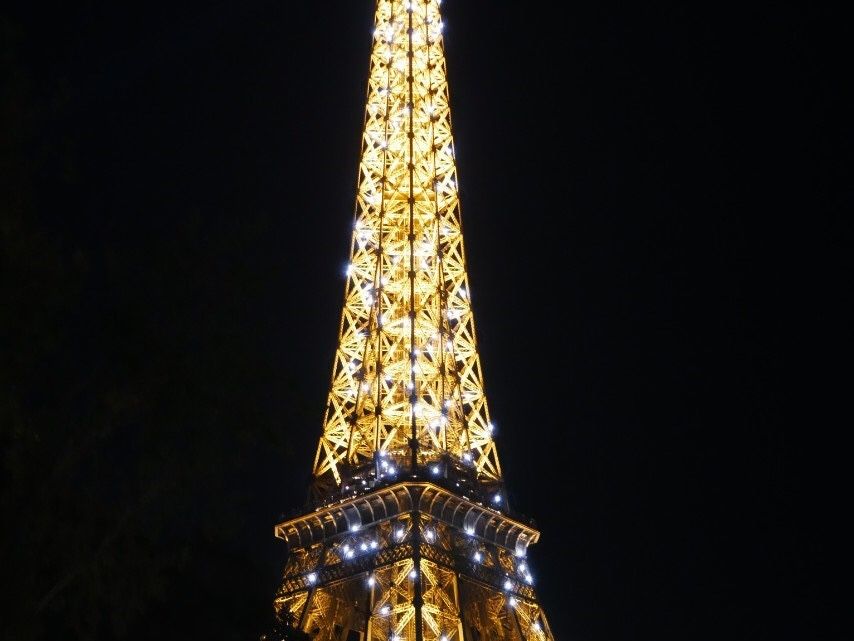 早めに出発場所に到着しましたが、待たされることなく、すぐ席に案内されて赤ワインのボトル一本と料理をサービスしてもらい、あっという間に時間がすぎ、ジャスト19時にエッフェル塔のシャンパンフラッシュが輝きだしまばゆい点滅が間近で見れて最高の夜になりました。