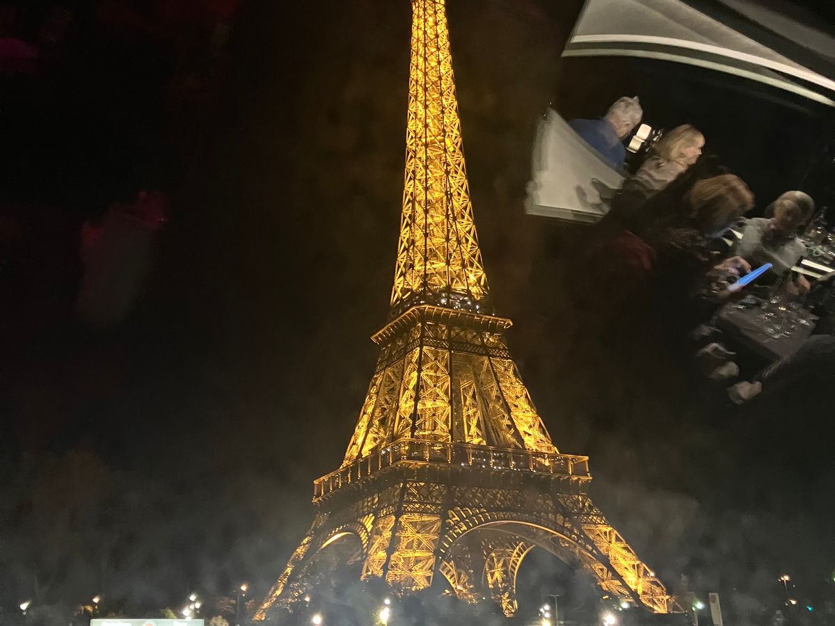 パリへは6度目でディナークルーズは4度目でした前の二回は他社一度はこの船でしたどちらの船も大きな変わりが在りませんでしたがホテルから徒歩で行ける会社にしていました何時もは普通の料理を食べながらのナイトクルーズの雰囲気を味わい良かったね~でしたが 今回イベント最大の00時丁度のエッフェル塔のシャンパンフラッシュが見れませんでした(-_-;) だったら他社にしたのにと二人でしょんぼりしていました、、、、、、